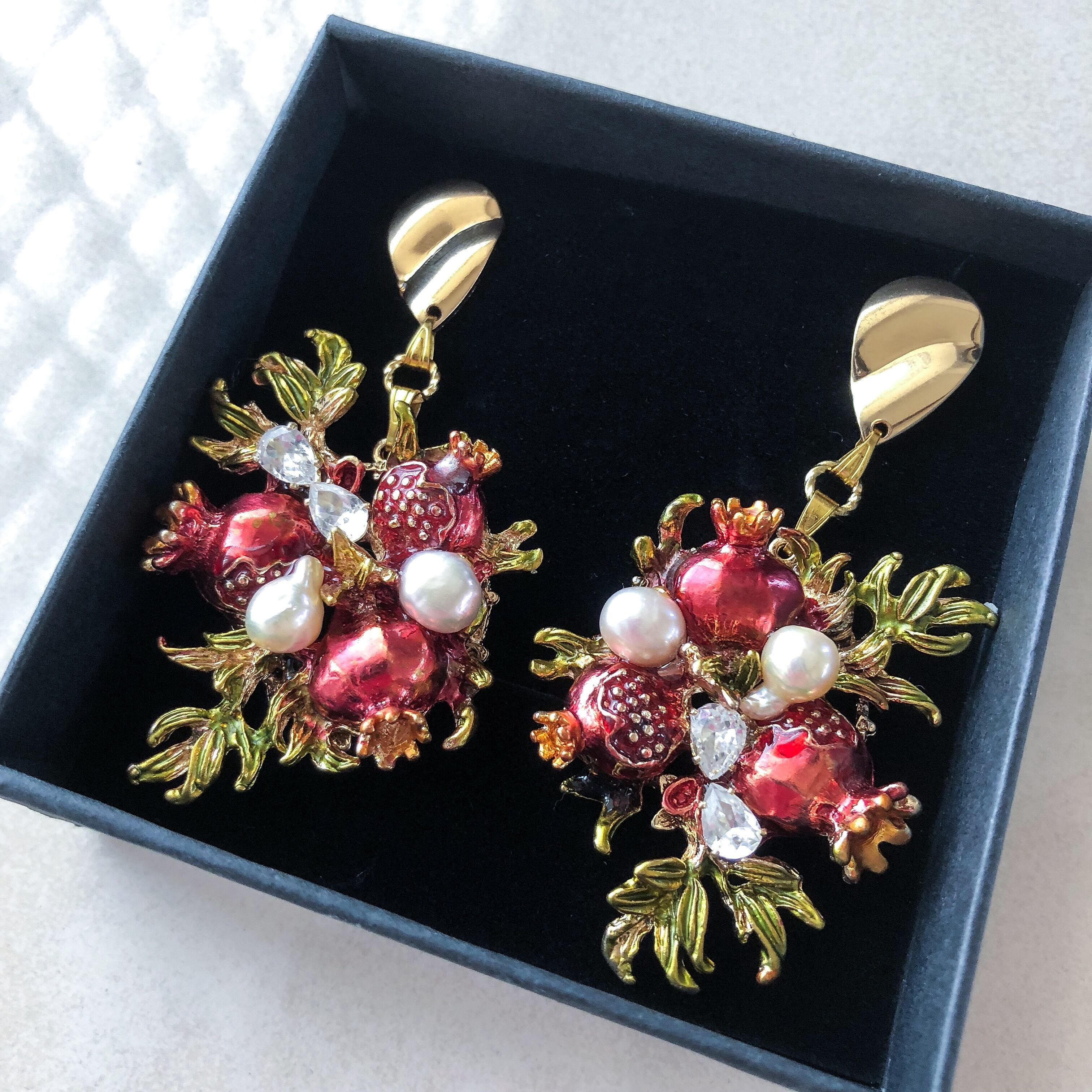 柘榴ラインナップにあしらった淡水パールは、実が溢れ出るようなイメージ。
